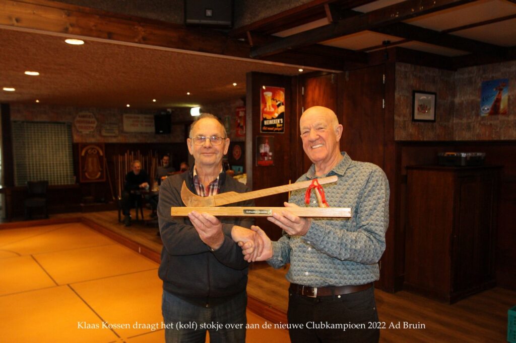 Donderdag was het dan zover, Ad Bruin was als nr. 1 uit de voorronde gekomen met 52 punten maar stond slechts 1 punt voor op drie andere spelers. In de tweede serie nam hij meer afstand door 56 punten te slaan en kwam met 108 punten op ruime voorsprong te staan. Dat had hij wel nodig want in de derde en laatste serie dreigde het nog mis te gaan toen hij tweemaal een poedel sloeg. Toch waren de 31 punten genoeg om de hoofdprijs te pakken. Piet Droog had de zege kunnen pakken maar sloeg ook twee poedels en eindigde op de derde plaats. Hans Tromp was het hele toernooi de meeste constante speler en eindigde daarmee als tweede. Met 139 punten was Ad de terechte kampioen. Klaas Kossen die 2 jaar lang op de wisseltrofee heeft mogen passen kon hem nu overdragen aan de nieuwe kampioen.