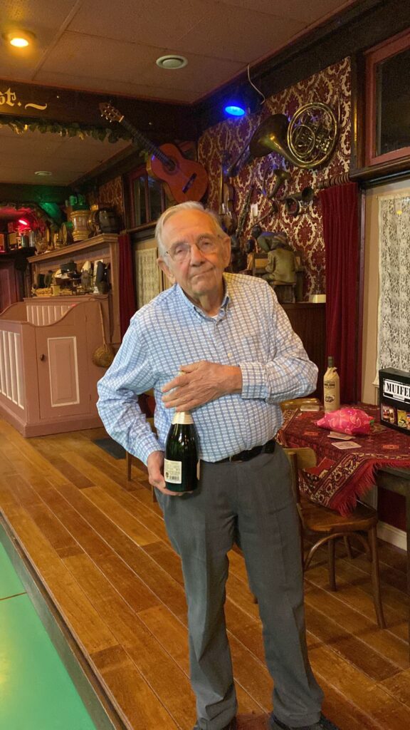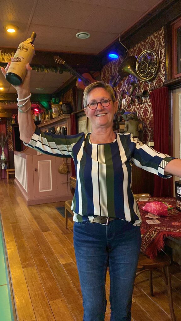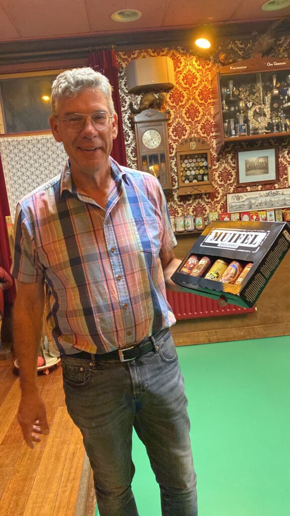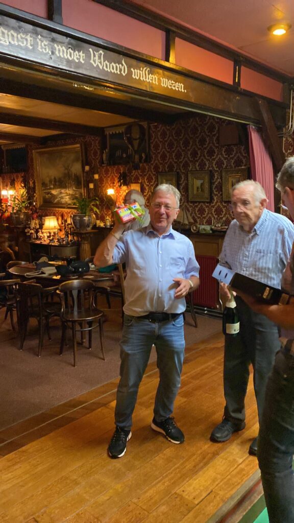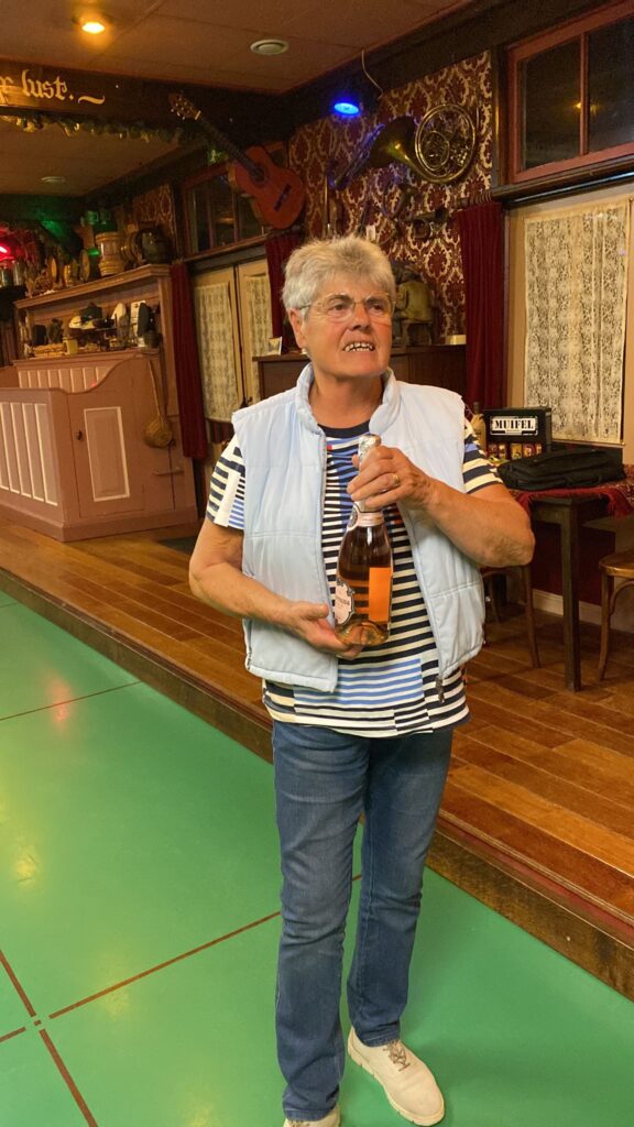 Het komt niet vaak voor dat er een zomerstop is in het Moriaanshoofd maar de komende 2 weken wordt er geen kolf gespeeld. Marc had ons simpel gezegd “het dak gaat er af”. Mooi feestje dachten wij. Als secretaris had ik een ieder gevraagd een leuk prijsje mee te nemen voor een groots kolffeest. Bleek dat Marc de kolfbaan de komende twee weken nodig heeft voor houtopslag omdat het dak van het koetshuis er af moet. Geen probleem. We hebben overal een oplossing voor en we waren gereed voor een kolffeest. Er waren 6 mooie prijzen Flessen bubbels, wijn, bier en chocolade. De wedstrijdcommissie moest nog wel even de software van de Open Wormer testen maar alles zou goed komen. Nou nee dus. In plaats van 10 slagen mochten we maar 5 slagen doen. Omdat er twee personen waren die 52 punten hadden geslagen mochten die samen het getal bepalen dat met de klokwedstrijd moest worden geslagen. Maarten noemde 36 en Mark zei 38. Het werd dus 37. Niet iedereen hoorde dit of zag dat 37 op het bord werd geschreven. Fennechien was het eerste slachtoffer. Geconcentreed speelde zij 38 punten bij elkaar om een lekkere fles veilig te stellen. 1 punt te veel dus helaas geen prijs. Niet getreurd de wedstrijdcommissie was nog steeds bezig om na te denken hoe de prijzen moesten worden verdeeld Vele kolfspelers deden hun best maar hadden geen idee op welke wijze de prijzen zouden worden verdeeld. Het was Chaos troef maar de wedstrijdcommisie is uiteindelijk tot een conclussie gekomen. Goudhaantjes en broodkolvers Jan en Gerda pakte ieder een eerste prijs. Leo en Lida werden ieder tweede en Maarten en Tiny werden derde. Het Bestuur viel dus weer goed in de prijzen. Zou dit doorgestoken kaart zijn? Hierbij de foto’s van de winnaars. Tiny staat helaas niet op de foto omdat zij de fotograaf was maar zouden jullie haar wel willen feliciteren want volgende week is zij jarig en wordt dan 55 voor de ?de keer. 30 Augustus zit het dak er weer op en is de kolfbaan weer te gebruiken. Tot dan.