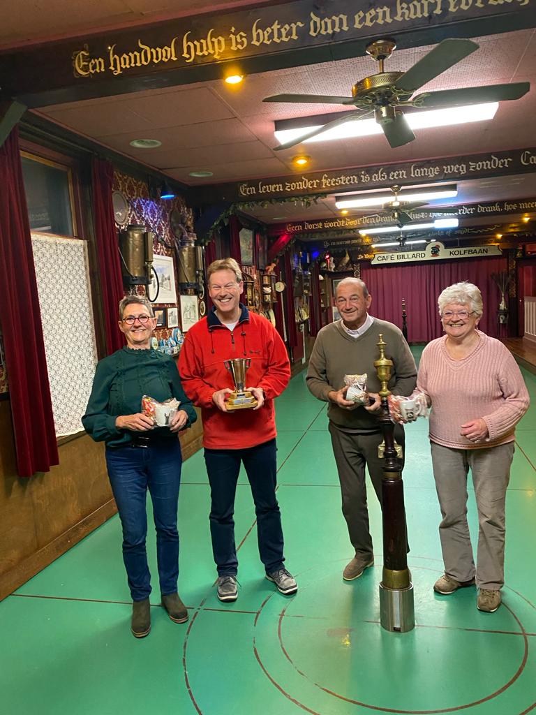 Ik zou alle kolfspelers kunnen behandelen maar doe dit niet omdat ik dan niet meer op de soosavond mag komen. ik hou het bij enkele voorbeelden zonder namen te noemen. “vorige week sloeg ik nog 59 punten op de kolfbaan van Buitenzorg, nu begin ik met en 2 en daarna een 3 snap jij dat nou?” of ik sloeg een 6 uit een aanbal (1e klasser)! Jij het niveau was echt bedroevend deze wedstrijd. Niemand leek te willen winnen of toch? Om een lang verhaal kort te maken. Lida Heinen schreef helaas geen kolfgeschiedenis door als eerste vrouw deze beker te winnen maar werd wel keurig derde met 97 punten. Theo Buddingh kwam als laatste het Moriaanshoofd binnen, zocht nog even zijn keu en bal en werd netjes tweede met 99 punten. Mark Abekrom zorgde er voor dat zijn naam tussen die van alle top kolfspelers op de trofee komt. hij sloeg 102 punten en werd de winnaar (met of zonder hulp van Freek) De Poedelprijs was deze keer voor Marga van Eerden
