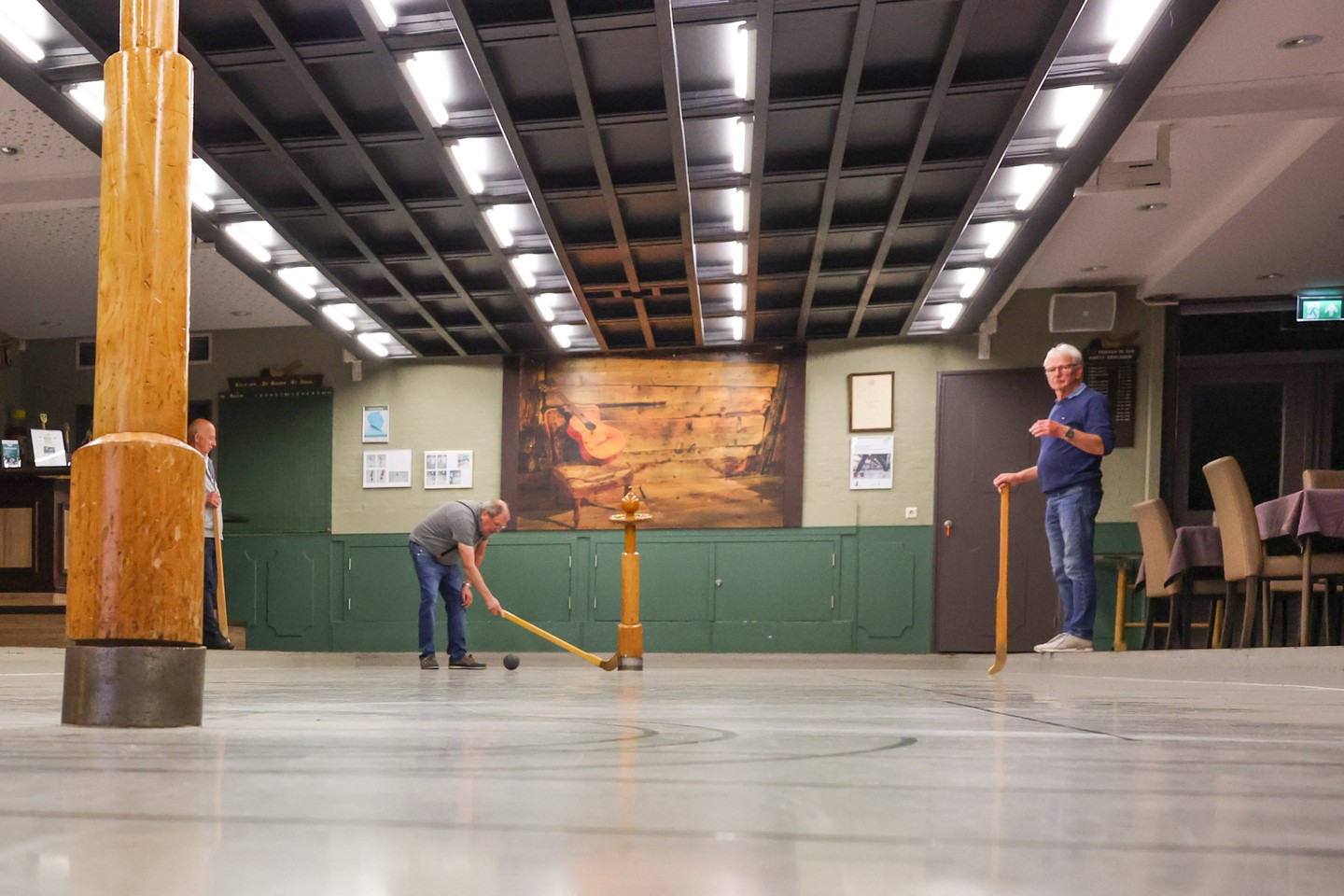 Tijd voor de laatste klap: de puntenklap, de bal via de paal in een puntenvak aan de overkant slaan. ,,We proberen het een paar keer”, is het voorstel van Jong. Direct bij de eerste keer is het raak. De bal gaat via de eerste paal van het veld richting de andere kant van het veld, raakt daar de paal en blijft liggen. ,,Dat is tien punten, niet slecht”, reageert Jong.