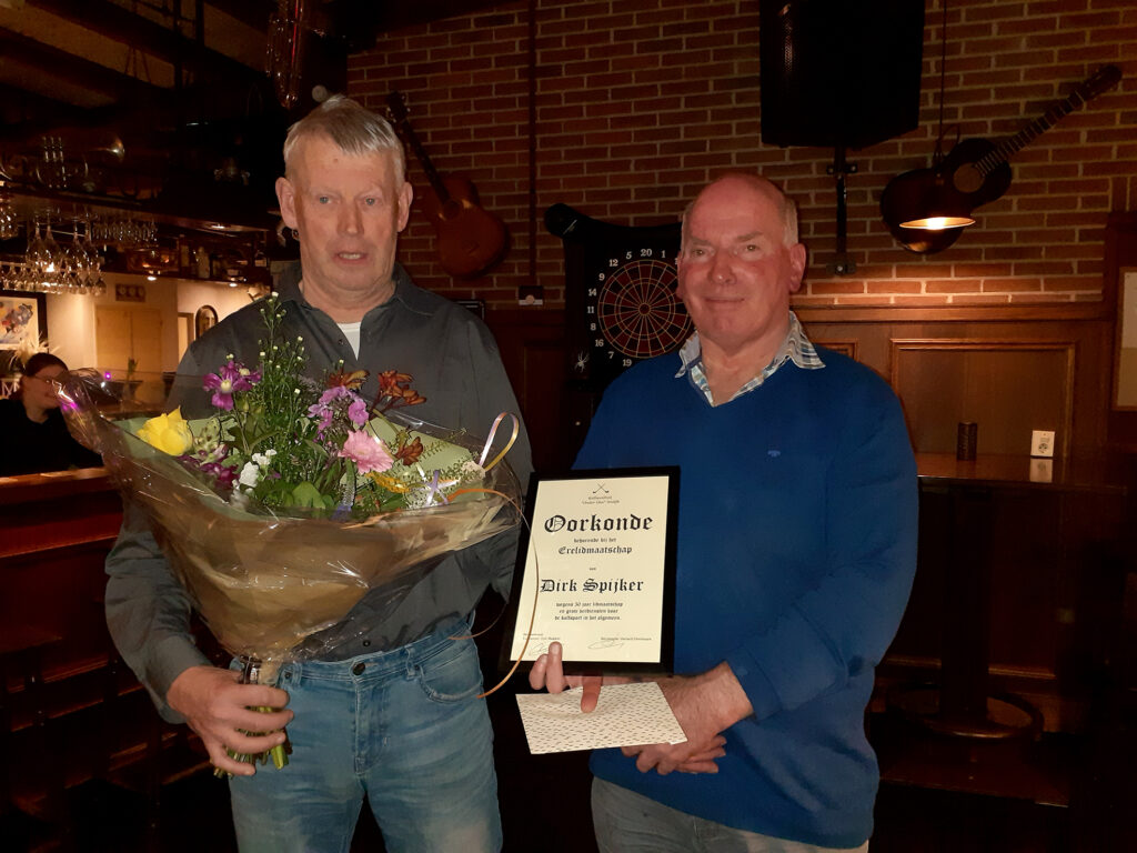Kortom, alle reden om Dirk voor te dragen voor het erelidmaatschap van onze sociëteit. Met een luid applaus van de aanwezige leden werd dit bekrachtigd. Een cadeaubon, bloemen en de oorkonde onderstreepten deze benoeming.