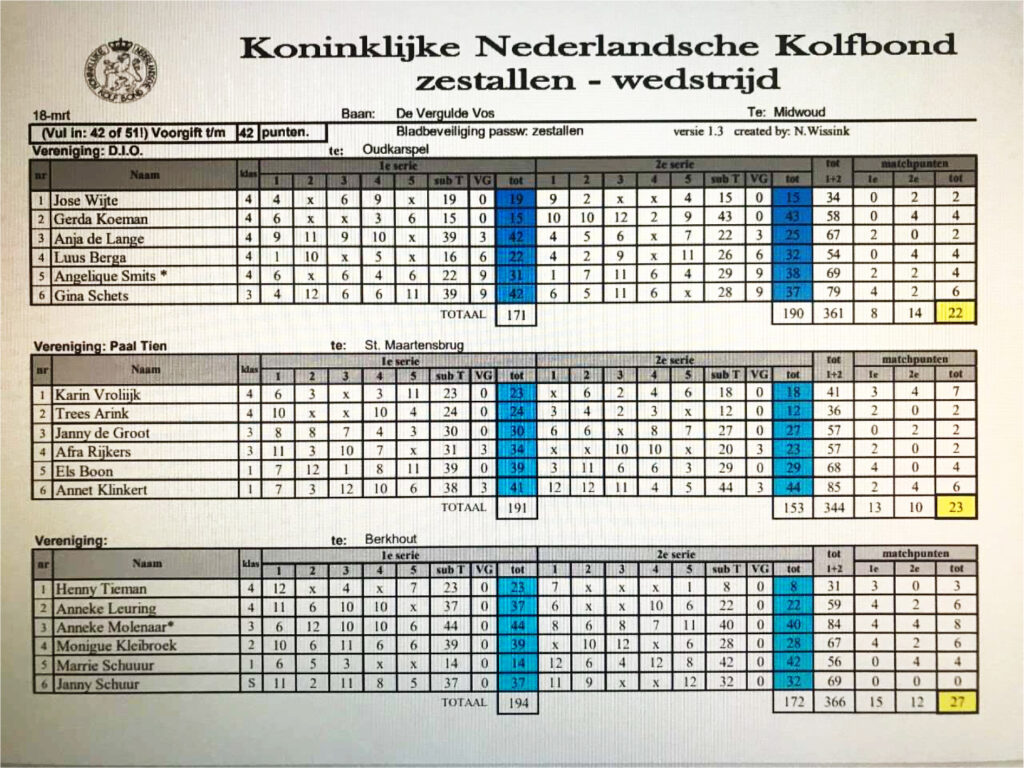 Halverwege de wedstrijd liep Paal Tien voorop met 15 matchpunten, DIO daarachter met 13 matchpunten en vervolgens RSJ met 8 matchpunten. Anneke Molenaar van Paal Tien was de enige die twee keer de maximale matchpunten voor haar team binnen haalde.