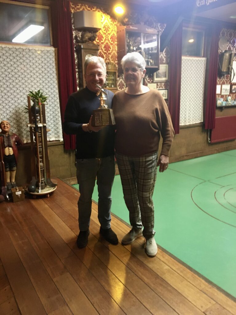 In januari van dit jaar boden de heren van Kolf societeit TOGIDO Wormer de dames van “De Moriaan” nog onderdak in hun vereniging. Na 150 jaar als Heren societeit te hebben gefunctioneerd bestaat de vereniging sinds januari 2023 uit zowel heren als dames. Onderlinge wedstrijden worden nu dus ook samen gespeeld en dat hebben de heren geweten! De eerste grote onderlinge wedstrijd om de mooie Molenbeker werd op magistrale wijze gewonnen door Gerda Jonker. Zij troefde alle mannen af. Zelfs Maarten van Zaanen (onze enige Superklas speler) was een maatje te klein voor Gerda. Na 5 slagen stond Maarten nog fier aan kop met 52 punten op de hielen gevolgd door Piet Groot, Mark Aberkrom, Fennechien Foeken en Gerda (allen met 51 punten). In de tweede 5 slagen legde Gerda de basis voor de overwinning. Zij sloeg er 51 punten bij en kwam op 102 punten. Alleen Mark kon haar volgen en sloeg er ook 51 punten bij en kwam ook op 102 punten. George Beumer werd keurig derde met 94 punten. Een barrage moest uitkomst brengen wie de winnaar zou worden. Gerda maakte korte metten met Mark en kwam als winnaar uit deze strijd (26 versus 25 punten).