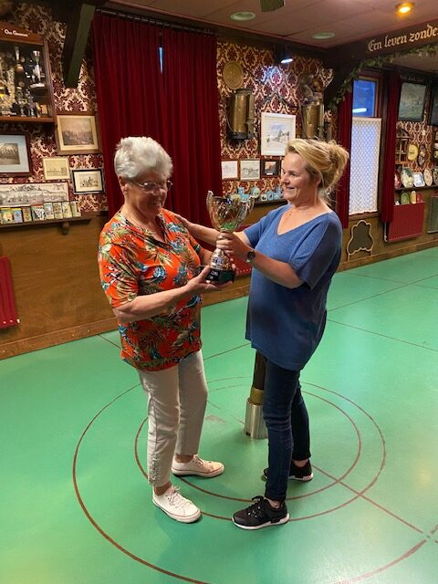 Gerda nam de beker in ontvangst die uitgereikt werd door Fennechien en de dames mochten nog een leuke attentie uit uitzoeken .