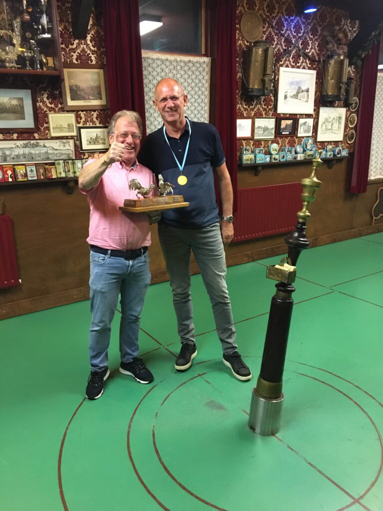 Vooraf was er veel consternatie.De Dames van TOGIDO – Wormer wilden absoluut meestrijden om de mooie Trofee “Het hanengevecht” en waren er als de kippen bij om te melden dat de naam van de Trofee gewijzigd moest worden in het Hanen / hennen gevecht. Nu heb ik niet veel verstand van hoenders maar op onze mooie trofee staan toch echt wel twee hanen en geen hennen. In de natuur is het gebruikelijk dat de mannetjes meer kleuren hebben en over het algemeen groter zijn als de vrouwtjes. Ja ik weet het, er zijn uitzonderingen. Maar onze dames in de vereniging zijn niet bang uitgevallen en wilde de strijd wel aan. Nou dat hebben ze geweten. De beste dame eindigde op een gedeelde 9de plaats ondanks de riante voorgift die alle dames krijgen bij onze onderlinge wedstrijden. Ik weet niet wat de dames is overkomen maar ze speelden als halve kip appelmoes! Gerda Jonker normaal goed voor 5 tot 7 twaalven wist het te presteren om 6 poedels te slaan. Daarmee wist zij niet eens de meeste poedels te slaan aangezien Lida Heinen met gemak 7 poedels wist te scoren. Wat is er aan de hand met onze hennen. Duidelijk een gevalletje “van de leg”. Daarentegen waren het de hanen die flink aan het kraaien waren. Peter Tock (what’s in a name) begon met 51 punten. Goudhaantje Maarten van Zaanen sloeg 50 punten in de eerste partij en Leo (Le Coq) Remmlzwaal stond daar vlak achter. George Beumer deed rustig aan. “Ik wil die beker helemaal niet winnen. Dat heb ik eerder al gedaan maar het kost je uren poetsen. De hanen zijn wel erg mooi maar dat komt door al dat gepoets. Dat doe ik echt niet meer.” In de tweede serie van 5 slagen werden de hennen verder van de hanen gescheiden. Klaas Vels sloeg 51 punten. Nooit eerder vertoont door Klaas maar trots als een Pauw (sorry Haan) liep hij door de baan. Ook Mark had wat goed te maken en sloeg er 51 bij. Dat was net op tijd want anders was er toch nog een hen geweest die meer punten had geslagen als een Haan. Het venijn zat in (Hanen) staart. Peter Tock en Leo le Coq wisten zichzelf uit te schakelen door een poedel te slaan maar Maarten ging als een echt Bantam Haan fier door tot de laatste klap. De bal lag echt zo slecht nog niet en hij had aan een drie genoeg om de Trofee mee naar huis te nemen. Hij had eerder in dit soort situaties koelbloedig toegeslagen en zijn sporen verdient. Nu moest hij denken aan zijn lieve vrouw thuis, zijn hennetjes op de zaak en zijn aanstaande pensioen. Langs de baan stonden naast de lokale Jagersvereniging ook nog twee Russiche toeschouwers. Maarten nam zijn tijd naar bezweek onder de inmense druk. De Bantam haan had negen keer groots gekraaid. Hij haalde adem maar er kwam slechts een schor stemmetje. Hij sloeg een twee en zag de trofee aan zijn snavel voorbij gaan. George was de grote winnaar en kan zich opmaken voor een gedegen poetsmiddag volgend jaar als hij de trofee weer spik en span mag terugbrengen.