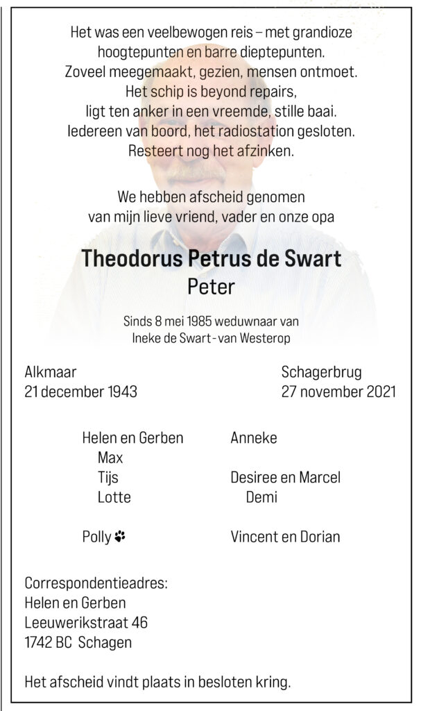 We wensen zijn vriendin, kinderen en kleinkinderen veel sterkte toe met het verlies.
