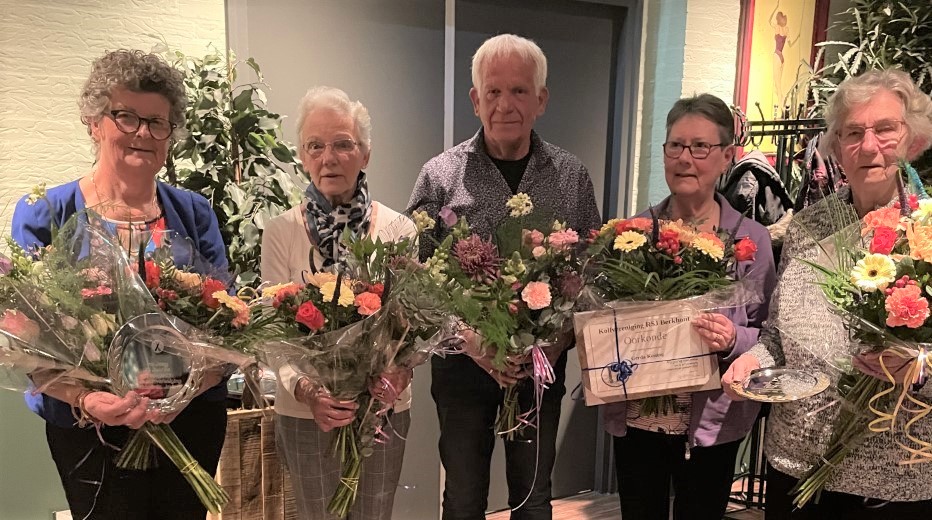 De oplettende lezer denkt nu je vergeet er één… Rob Blom deed een woordje voor mijn persoontje omdat ik in 2021 25 jaar lid was van onze vereniging. Ook ik was blij met deze aandacht en kreeg een verzilverd bordje, speldje van de KNKB en bloemen.