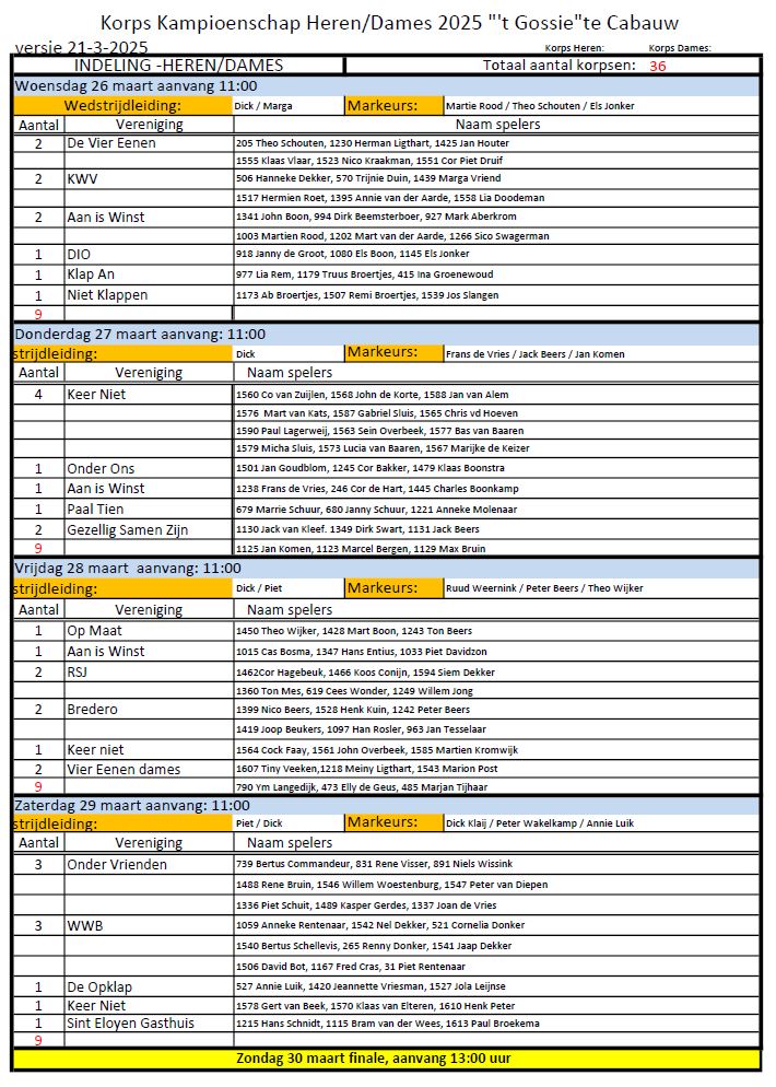 Hierbij doen wij jullie de laatste versie van de indeling voor het Korpskampioenschap in Cabouw toekomen.
