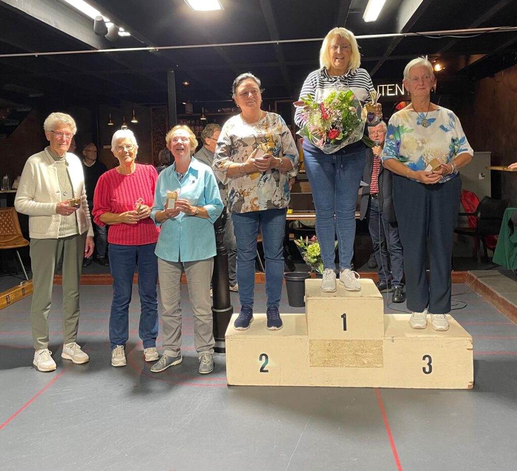 In de 1e klasse namen Hannie Bakker, Els Boon en Tineke de Best het tegen elkaar op. Karin Vrolijk rammelde aan de deur door 112 punten te slaan. Alleen Els kon dat verbeteren sloeg 113 punten en won, Tineke bleef steken op 105 punten.