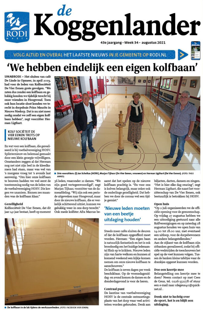 Op vrijdagavond 27 augustus is in aanwezigheid van vele bestuursleden van vele kolfverenigingen uit Noord Holland door Dhr. Peter van de Nieuwenhof de kolfbaan geopend die door leden en vrijwilligers is gemaakt binnen de accommodatie van HOSV, Na het door knippen van een lint opende de voorzitter de baan , de vele aanwezigen konden allemaal voor het eerst een blik werpen op een schitterende kolfzaal die alleen maar uitnodigt om te kolven. In het midden van de kolfbaan stond een cadeau in feestverpakking, de voorzitter van de KNKB nodigde de voorzitters van de dames & heren kolfver. en van HOSV uit om het cadeau uit te pakken. Het blijkt een AED defibrillator te zijn, de voorzitter zegt in zijn woord dat een belangrijk en noodzakelijk medisch hulpmiddel is en waarvan hij hoop dat het nooit gebruikt hoeft te worden. De voorzitter van HOSV bedankte namens de verenigingen de KNKB voor dit cadeau en de noodzaak dat er binnen de vereniging een AED aanwezig moet zijn. De vele aanwezigen zagen de voorzitter Dhr.. Peter van de Nieuwenhof van de KNKB & de voorzitster van de damesvereniging Mevr. Marjan Tijhaar hierna de eerste klap verrichten en de kolfbaan officieel te hebben geopend, de vele aanwezigen namen uitgebreid de tijd om de kolfbaan te bewonderen en complimenteerde de Kolfvereniging “De Vier 1111” met een werkelijk schitterende kolfzaal welke voor div. doeleinden gebruikt gaat worden.