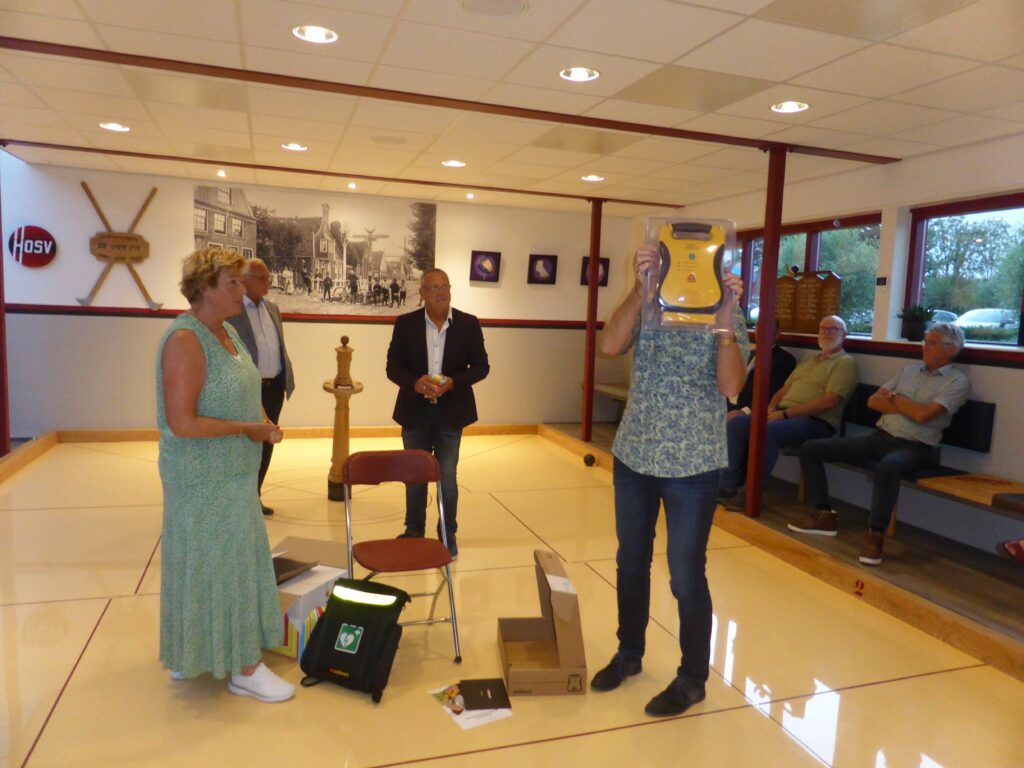 Voorzitter van Koninklijke Nederlandse Kolfbond schenkt AED aan kolfver.”De Vier 1111” & HOSV bij de opening van de kolfbaan in de accommodatie van HOSV.