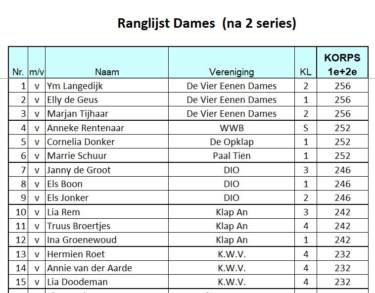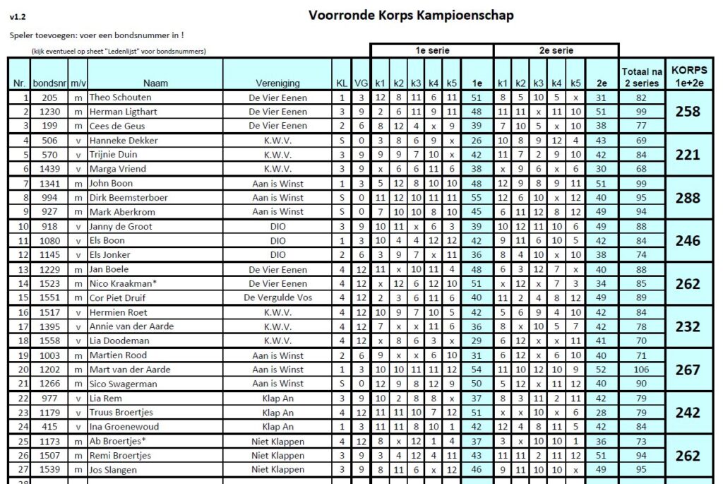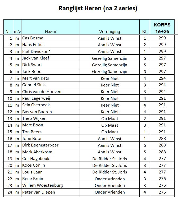 Tussenstand Korps kampioenschap 2025 / 3-Wedstrijdberichten / Door Jan Blaauw Bijgewerkt t/m zaterdag 29 maart 2025Er gaan 8 heren korpsen naar de finaleEr gaan 5 dames korpsen naar de finaleVanavond volgt de indeling voor de finaleKlik hier voor de volledige lijst