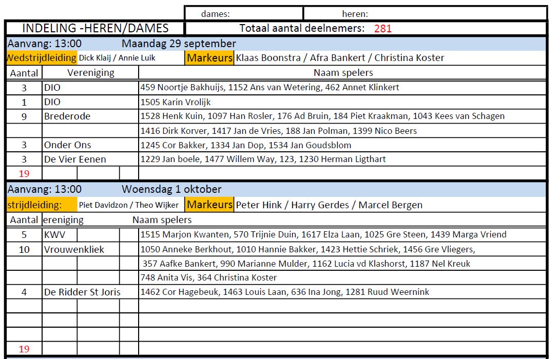 KK heren en dames 2025 van 29 sep t/m 12 okt “De Roode Leeuw” te Zuid-Scharwoude