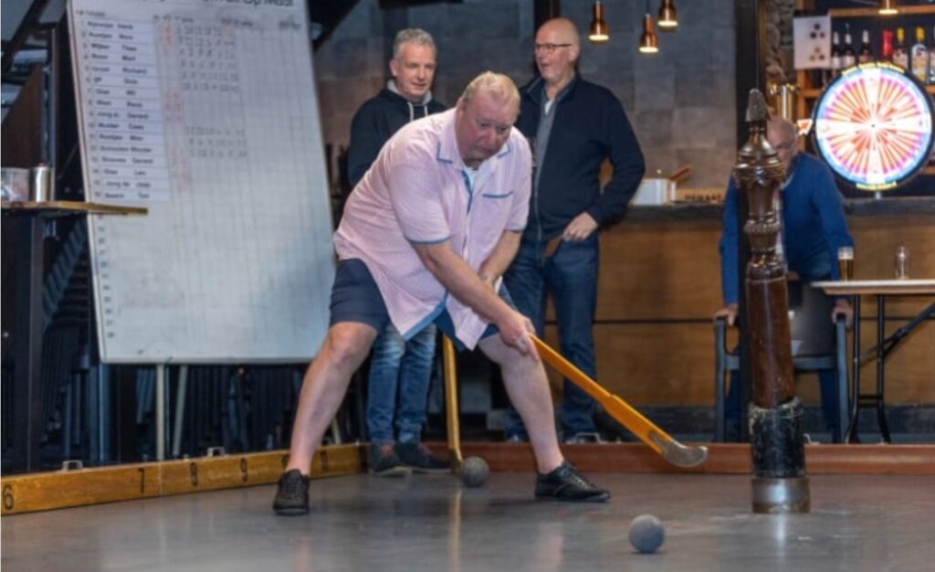 Gerard (51) had wat beginnersgeluk maar belandde daarna meteen in een dip. “Ik moest met enige overtuigingskracht worden overgehaald om mee te doen. Ik zat hier elke donderdag aan een biertje, onder andere met mijn vriend René, gewoon voor de gezelligheid. maar vanuit de zaal werd herhaaldelijk aan ons gevraagd of we niet een keer mee wilden spelen. Aangezien het biljart er niet meer staat, wat we eerder graag deden op deze avond, besloten we in oktober jl een keer mee te doen. Om van het gezeur af te zijn.” Dat beviel goed, vooral de combinatie van sport/spel met gezelligheid. “De enige sport waar je tijdens het spelen gewoon bier kan drinken. Alleen wel jammer dat we tegenwoordig buiten moeten roken”, wordt er door de mannen gegrapt. De meeste kolfverenigingen noemen zich sociëteiten, zo ook in dit geval, want naast een sport is kolven dus met name een sociale bezigheid. Op een gemiddelde kolfavond bevinden zich zo’n twintig aanwezigen, waarvan er steeds drie in de baan lopen om het spel te spelen. De anderen kaarten, volgen het spel of praten met elkaar. “Er is geen concurrentie onderling, kolvers applaudisseren voor elkaar en als beginner word je aan alle kanten geholpen en aangemoedigd”, vertelt Gerard. “Maar sommigen leren het nooit hoor”, vult Willem droogjes aan.